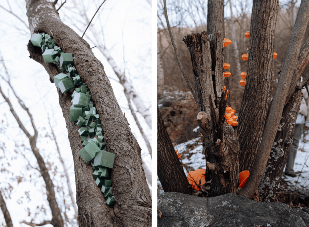 蔡韵涵的《迁徙计划》将植物种子封存于冰中,待春来冰融,种子随溪水漂流,完成一次自然的随机迁徙;她的《冰花》则在寒夜中用水与低温为枯木赋予新的生命形态,探讨消亡与重生。