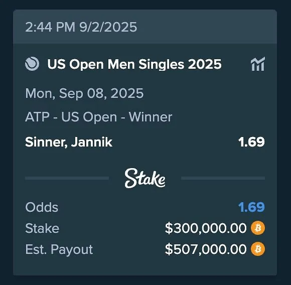 2025美网公开赛投注,美网盘口赔率,美网冠军预测,美网投注网站,美网网球赛直播/2025美国网球公开赛全面开盘,提供最新美网盘口赔率、赛程赛果、冠军预测及权威分析,助力网球迷与玩家安全、快捷地参与美网投注。虎扑09月03日讯 据欧洲体育报道,加拿大说唱巨星“公鸭”德雷克刚刚下注30万美元压辛纳赢得今年美网冠军。如果辛纳夺冠,德雷克将赢得20.7万美元。