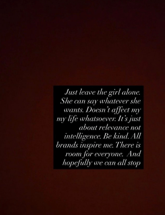 对此,赛琳娜ins发文回应:“别管她了,她想说什么就说什么,这根本不影响我的生活。这只关乎相关性,而非智力,保持友善。所有品牌都激励着我,每个人都有自己的空间,希望我们都能停下来。”