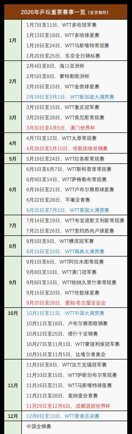 根据国际乒联官网公布的信息(注:赛事时间可能会有所调整),今年不仅涵盖了个别单项赛事和团体赛事,还有多个综合性大型比赛,尽管文中仅提供乒乓球项目开赛时间,但足以反映本年度乒乓球赛程的密集程度。