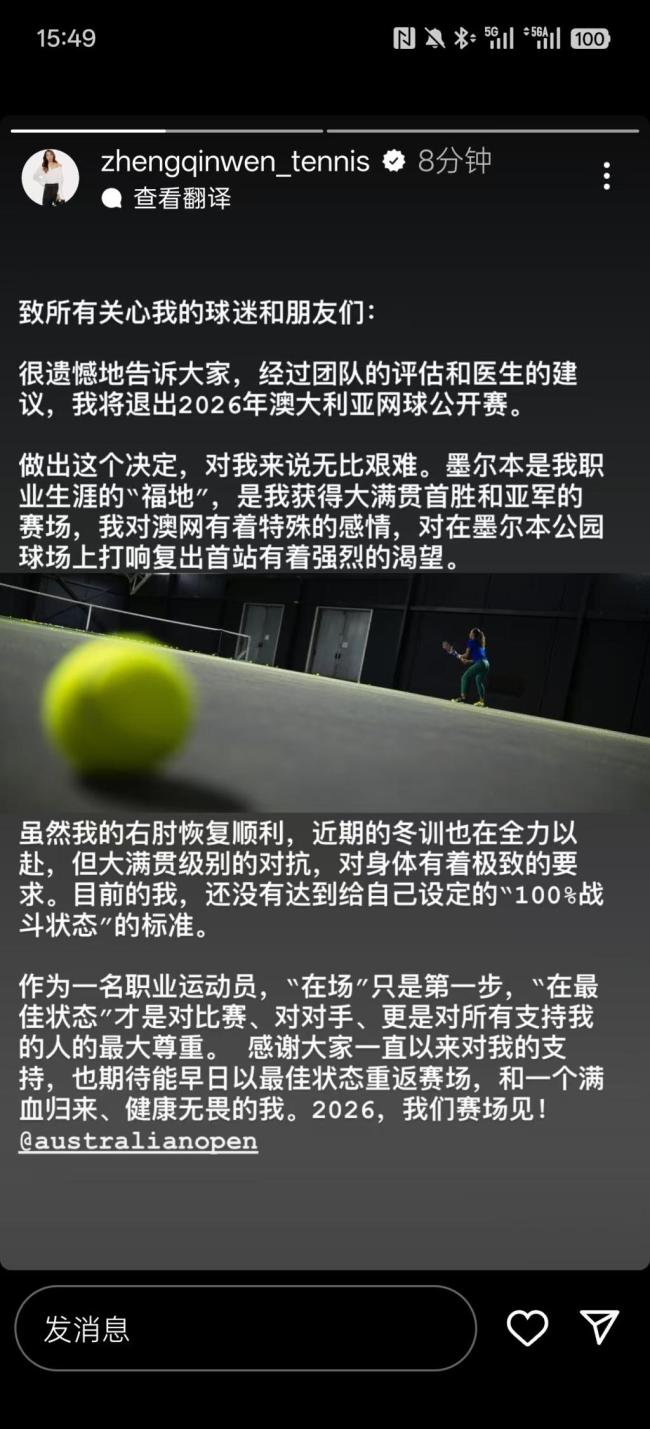 作为一名职业运动员,“在场”只是第一步,只有在最佳状态下才能对比赛、对手以及支持她的人表示最大的尊重。她感谢大家一直以来的支持,并期待能早日以最佳状态重返赛场,展示一个满血归来、健康无畏的自己。2026年,我们赛场见!
