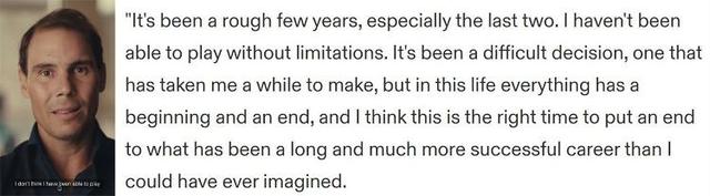 在宣布自己将于11月19日至27日举行的戴维斯杯赛后退役时,纳达尔说:“这些年我过得很艰难,尤其是过去两年。我再也不能不受限制的打球了。退役是很艰难的决定,我花了不少时间才下定决心。不过在人生里,凡事有始就有终。”