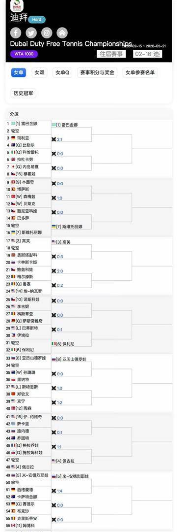 让我们把视线转向本届迪拜站的其他焦点。2月14日,赛事抽签仪式揭晓,总奖金高达4,088,211美元,吸引着无数顶尖选手前来争夺。冠军不仅能捧起象征荣耀的奖杯,更能独揽1000个排名积分和665,000美元的巨额奖金。2月15日至21日,这场网球盛宴将在迪拜免税店网球体育场的室外硬地球场激情上演,单打设有56个签位,前八号种子选手则享有首轮轮空的特权。